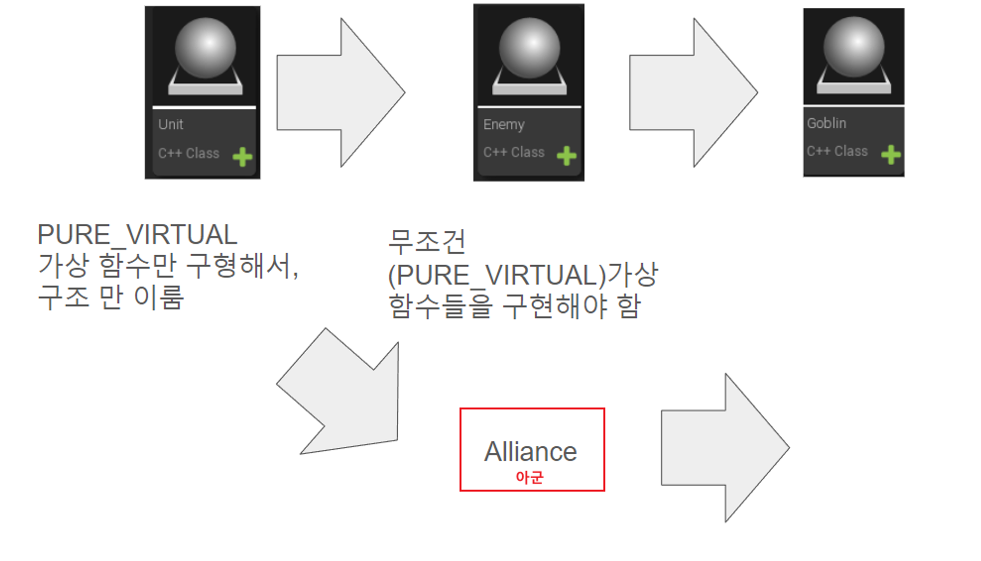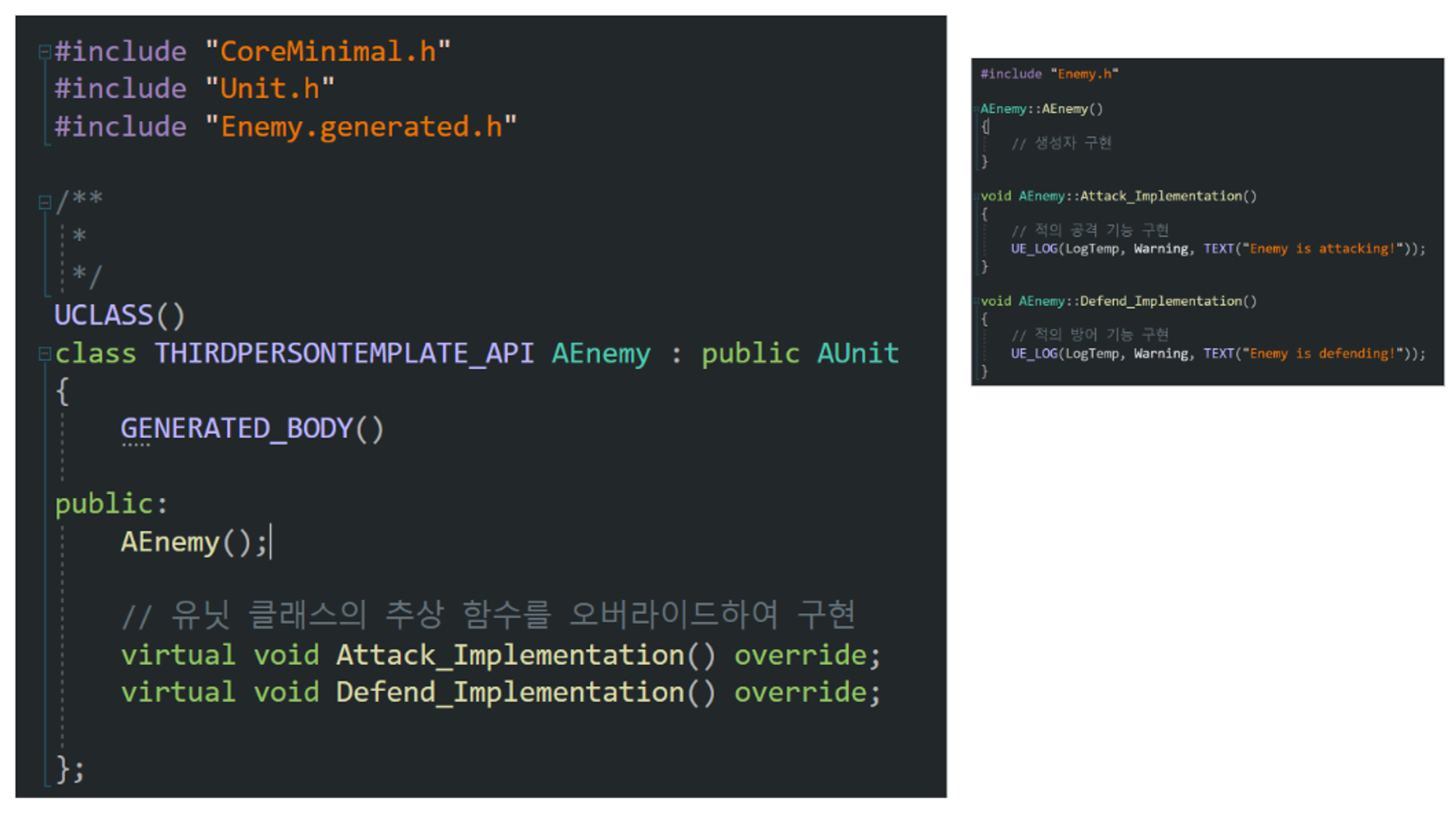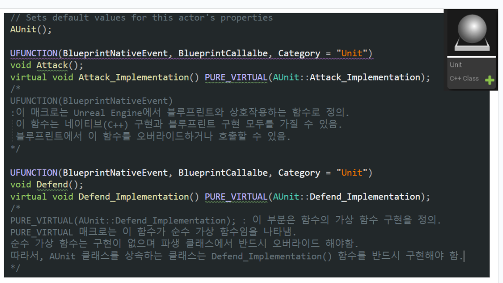 : 이 부분은 함수의 가상 함수 구현을 정의. PURE_VIRTUAL 매크로는 이 함수가 순수 가상 함수임을 나타냄. 수수 가상 함수는 구현이 없으며 파생 클래스에서 반드시 오버라이드해야함. 따라서, AUnit 클래스를 상속하는 클래스는 Defend_Implementation() 함수를 반드시 구현해야함.